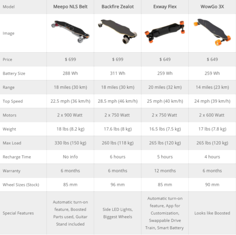 But we have to say that the Boosted Stealth and Plus are not Meepo’s competitor anymore. Let’s take a look at a comparison between the Meepo NLS Belt, the Backfire Zealot, the Exway Flex, and the WowGo 3X.